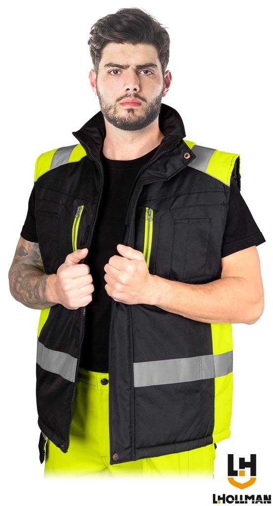 BEZRĘKAWNIK OCHRONNY OCIEPLANY, PASY ODBLASKOWE CZARNO-SELEDYNOWY