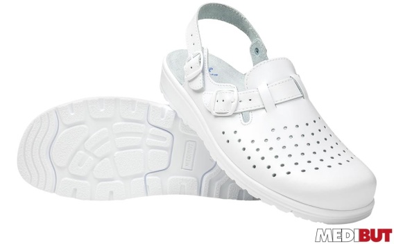 - wierzch perforowany ze skóry naturalnej białej z paskiem do regulacji tęgości, odporny na codzienne mycie i dezynfekcję