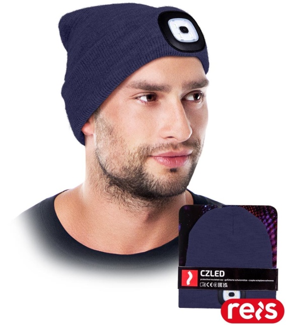 CZAPKA OCHRONNA OCIEPLANA POLAREM Z WYMIENNĄ LATARKĄ LAMPKĄ LED GRANATOWA