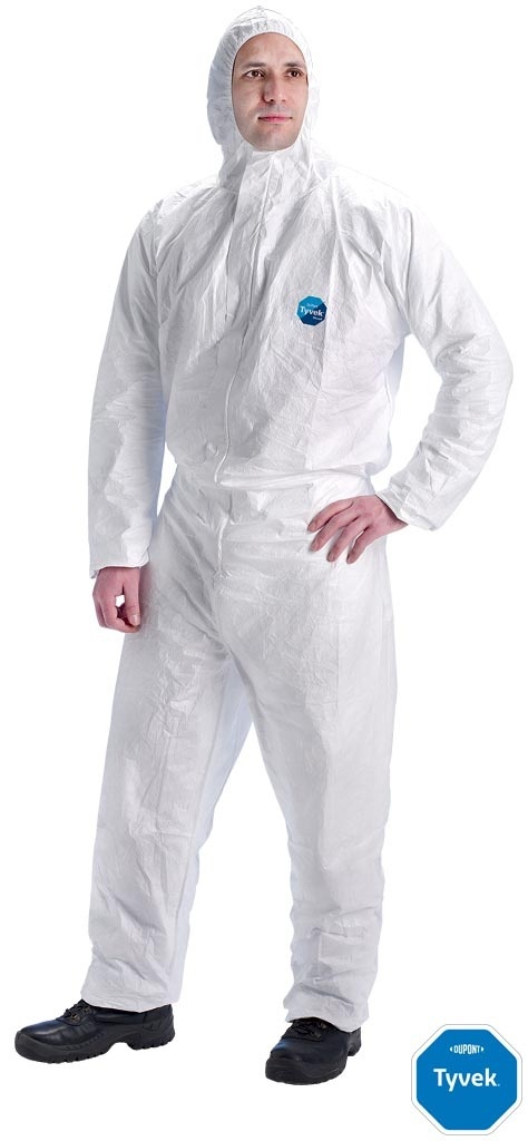 - przód kombinezonu wykonany z włókniny Tyvek®, chroni przed natryskiem ciekłą substancją chemiczną oraz przed drobnymi cząstkami stałymi