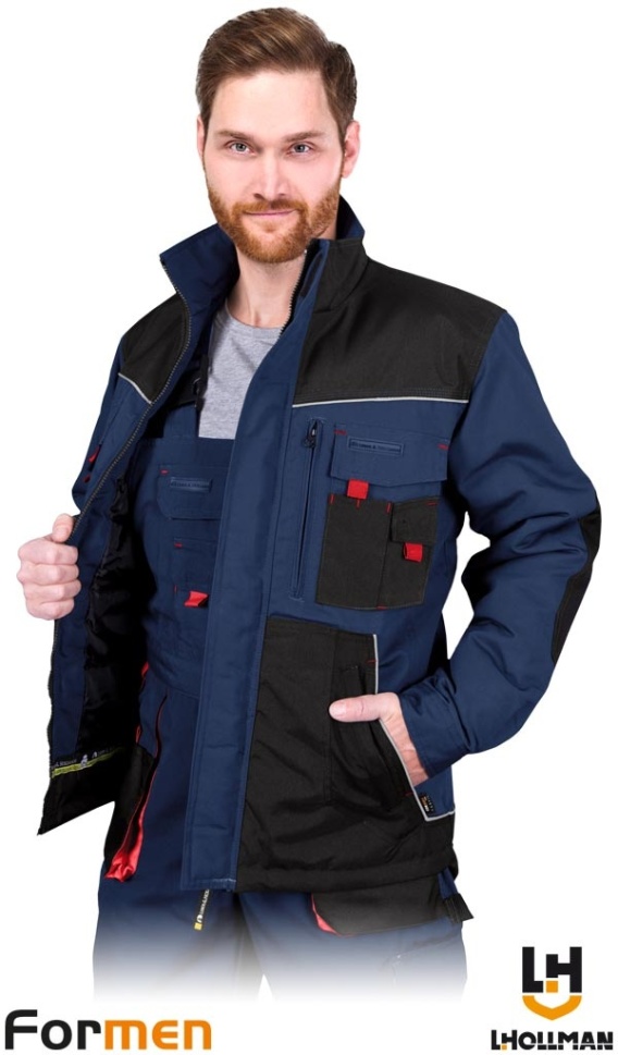 KURTKA OCHRONNA OCIEPLANA FORMEN FMNW, KIESZENIE ,PRZEDŁUŻANY TYŁ GRANATOWO-CZARNO-CZERWONA