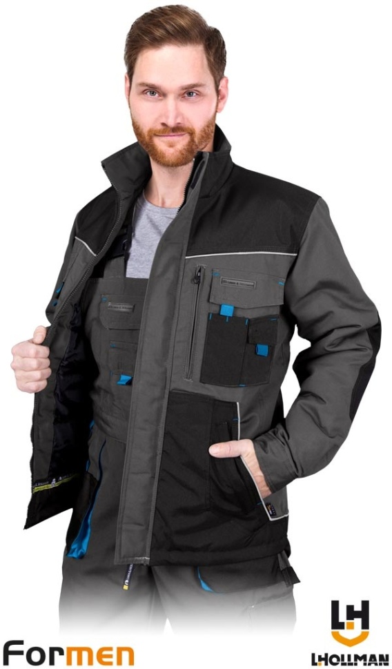 KURTKA OCHRONNA OCIEPLANA FORMEN FMNW, KIESZENIE ,PRZEDŁUŻANY TYŁ SZARO-CZARNO-NIEBIESKA