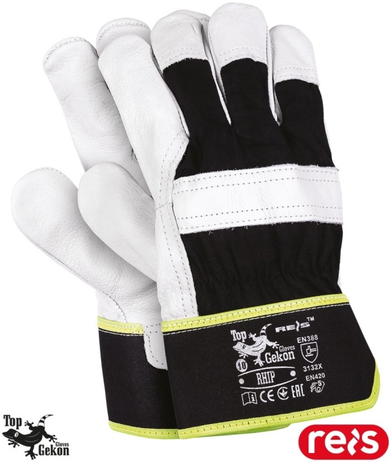 RĘKAWICE OCHRONNE RHIP SKÓRA BYDLĘCA LICOWA CZARNO-BIAŁE, BUDOWA, 12 PAR