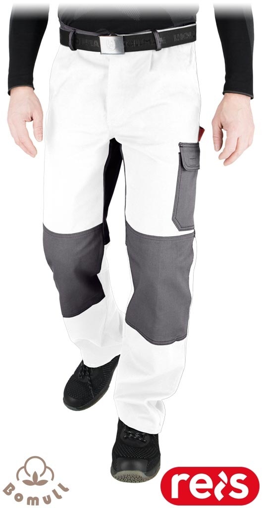 SPODNIE OCHRONNE DO PASA BAWEŁNIANE ROBOCZE, REGULACJA W PASIE, KIESZENIE NA NAKOLANNIKI, BOMULL, BIAŁO-SZARE