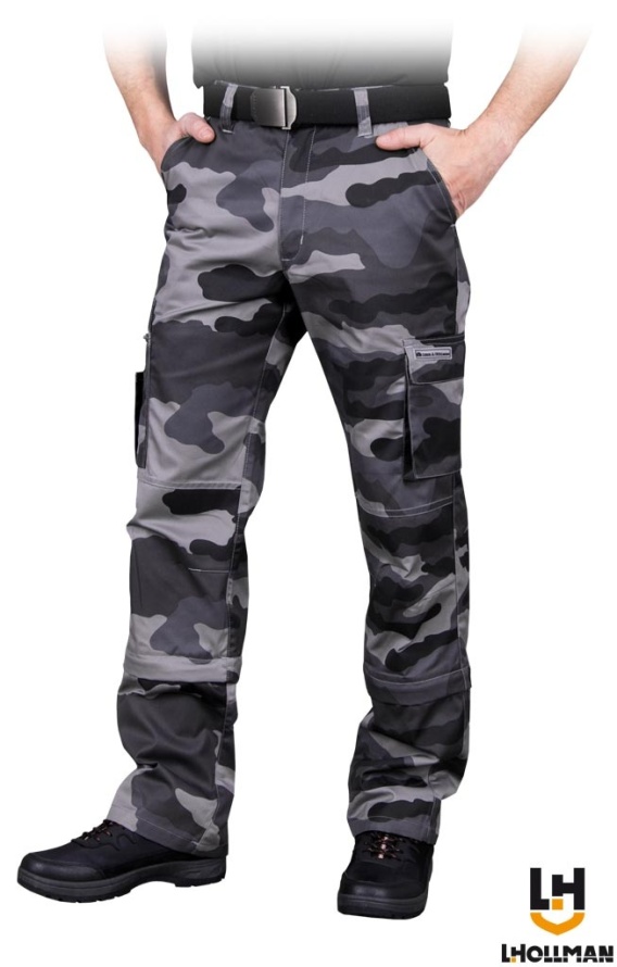 Spodnie ochronne do pasa w kolorze moro z odpinanymi nogawkami.