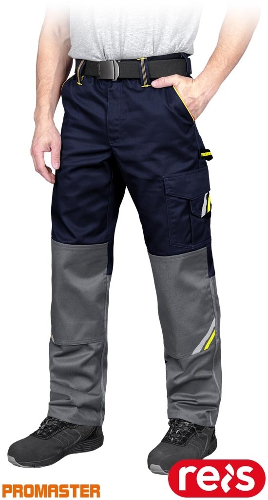 SPODNIE OCHRONNE DO PASA PROX WSTAWKI ODBLASKOWE, KIESZENIE NA NAKOLANNIKI GRANATOWO-ŻÓŁTO-SZARE