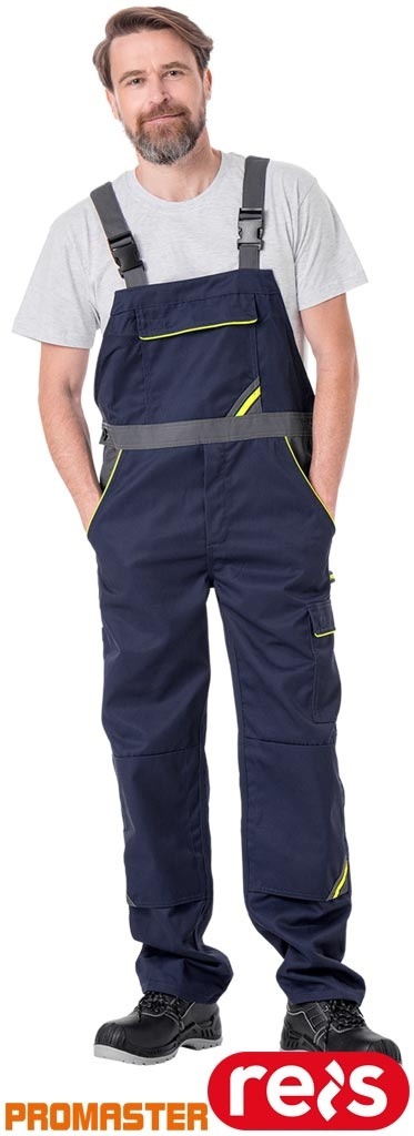 SPODNIE OCHRONNE OGRODNICZKI PRO REGULACJA W PASIE, KIESZENIE NA NAKOLANNIKI GRANATOWO-ŻÓŁTO-SZARE