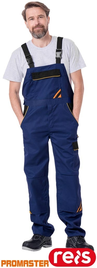 SPODNIE OCHRONNE OGRODNICZKI PRO REGULACJA W PASIE, KIESZENIE NA NAKOLANNIKI NIEBIESKO-CZARNO-POMARAŃCZOWE