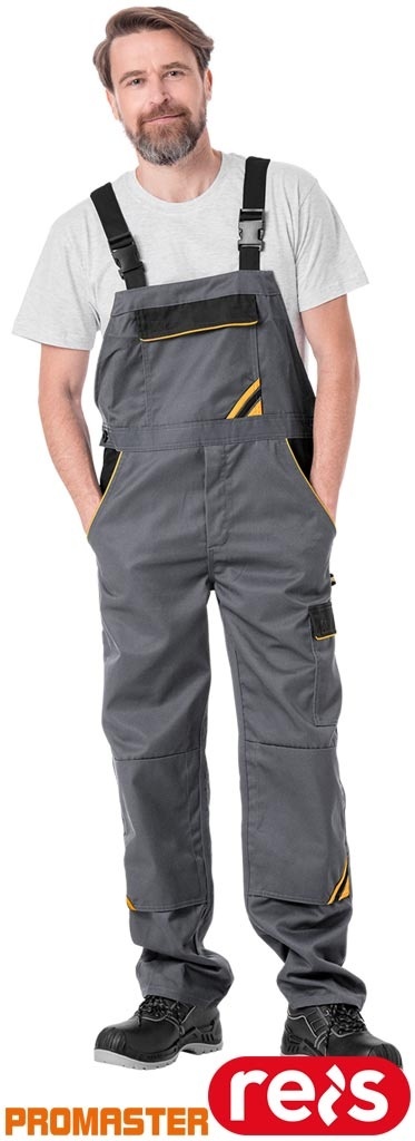 SPODNIE OCHRONNE OGRODNICZKI PRO REGULACJA W PASIE, KIESZENIE NA NAKOLANNIKI SZARO-CZARNO-POMARAŃCZOWE