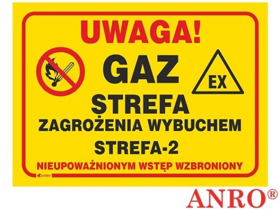 Znak uzupełniający - gaz „Uwaga! Gaz strefa zagrożenia wybuchem z-2 (...)" ZNAK BEZPIECZEŃSTWA - 250x350 mm PŁYTA PCV
